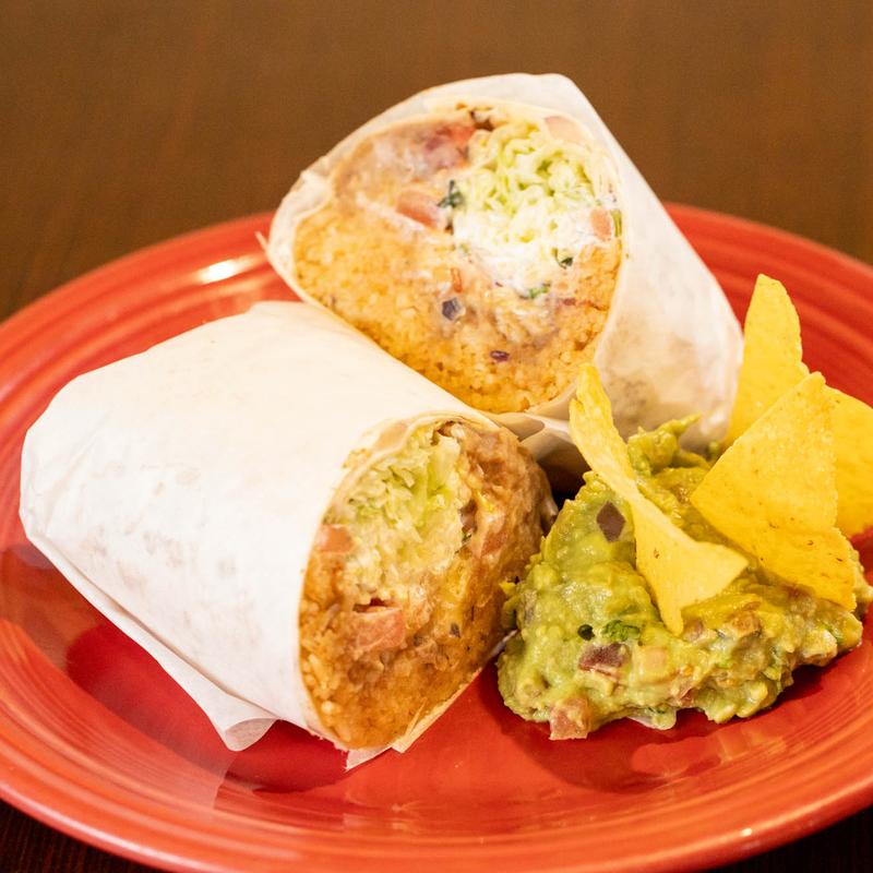 A burrito made of rice, refried beans, sour cream, shredded cheese, pico de gallo, shredded lettuce, wrapped in a flour tortilla garnished with guacamole • With: Cheese $12.95 | Veggies $13.95 | Grilled Chicken $15.95 | Shrimp $15.95 | Ground Beef $15.95 | Carne Asada $16.95