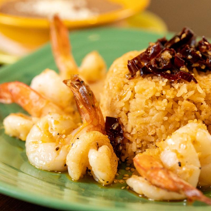 A traditional jumbo shrimp dish with garlic, olive oil, guajillo flakes. Served with rice and beans.