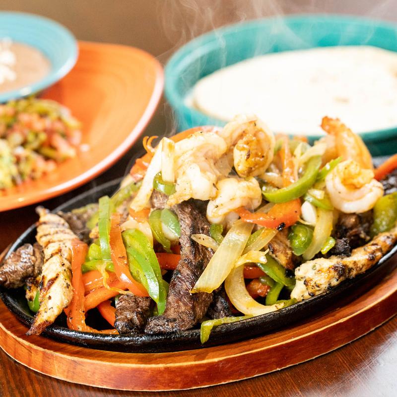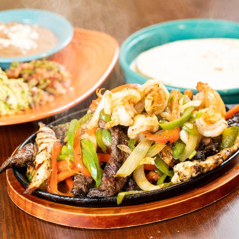 Marinated Skirt Steak or Chicken Breast Strip grilled with onions, green and red peppers over a Mesquite flame. Served with rice, refried beans, nopalitos tiernos, guacamole and your choice of Corn or Flour Tortilla Your Choice of protein • Veggies $26 | Grilled Chicken $29 | Steak $31| Shrimp $29 | Chicken & Shrimp $31 | Chicken & Steak $32 | Steak & Shrimp $34 | Chicken, Shrimp and Steak $37