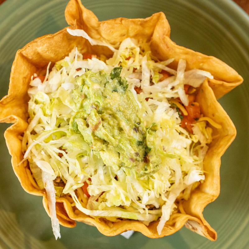 A flour tortilla bowl filled with iceberg lettuce, tomatoes, cucumbers, onion, cilantro, Carrots, jalapeno, and sliced avocado, dressing on the side • With: Veggies $14.95 | Ground Beef $15.95 | Grilled Chicken $15.95 | Shrimp $15.95 | Carne Asada $16.95 | Salmon $15.95
