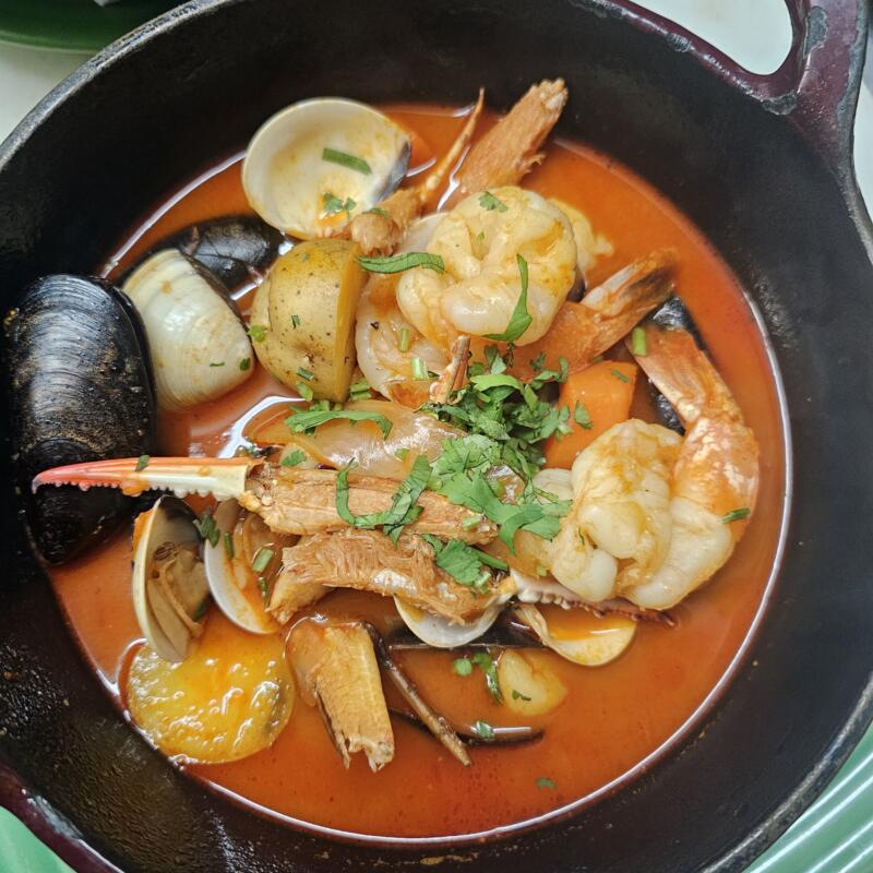 A tasteful soup of epazote, clams, mussels, baby scallops, snow crab claws and jumbo shrimp in guajillo broth. Served with bread.