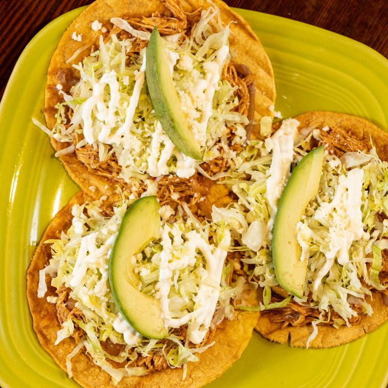 Three flat deep fried corn tortillas spread refried beans, marinated shredded chicken with chipotle sauce, and onions topped with queso fresco, sour cream, avocado, shredded lettuce. Served with rice and beans.
