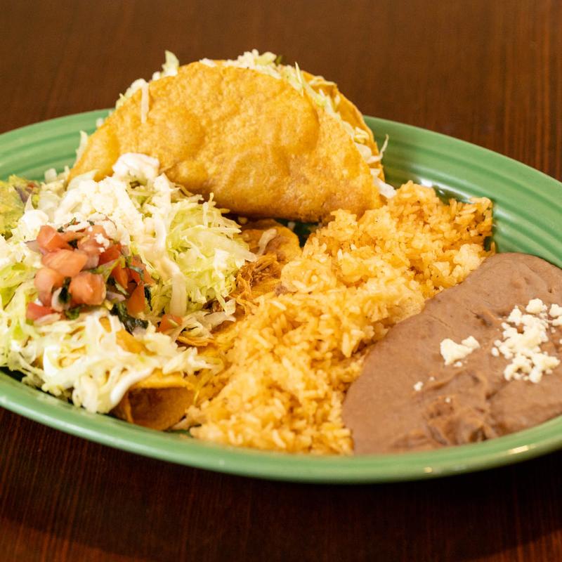 Three hard taco shells stuffed with Ground Beef or Shredded Chicken, lettuce, queso fresco, sour cream, pico de gallo. Served with rice and beans.